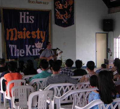 After a time of praise and worship music, I sang a couple of songs with my guitar. Notice in some of these pictures the beautiful banners in the back ground. These were relatively inexpensive to have made and are a great reminder to everyone of how awesome our God is, and how deserving He is of our worship. |